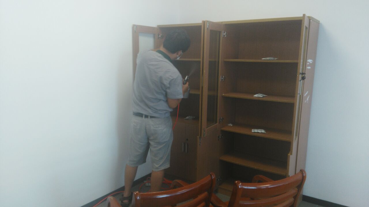 針對其結構特點及污染情況,我公司技術及施工人員經過認真考察,制訂了合格的施工方案,針對易散發甲醛等有害物質的污染源,重點治理,對重新粉刷的墻面使用我公司研發的利純納米光觸媒進行甲醛清除,這些地方光照量較充足,便于光觸媒對甲醛的分解,對于刷漆的辦公家具、書桌、儲物柜、木門、地板等采用甲醛清除劑進行處理,針對不同污染物,做分別處理。經過我公司重點治理,一周后復查結果各種有害物質含量均已達到國家標準以內,各項指數均達標。客戶員工感覺氣味明顯消除,為業主清理甲醛,還顧客一個安全,健康的生活環境是我們全體工作人員的責任,下面為施工現場照片:
